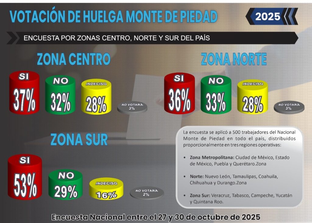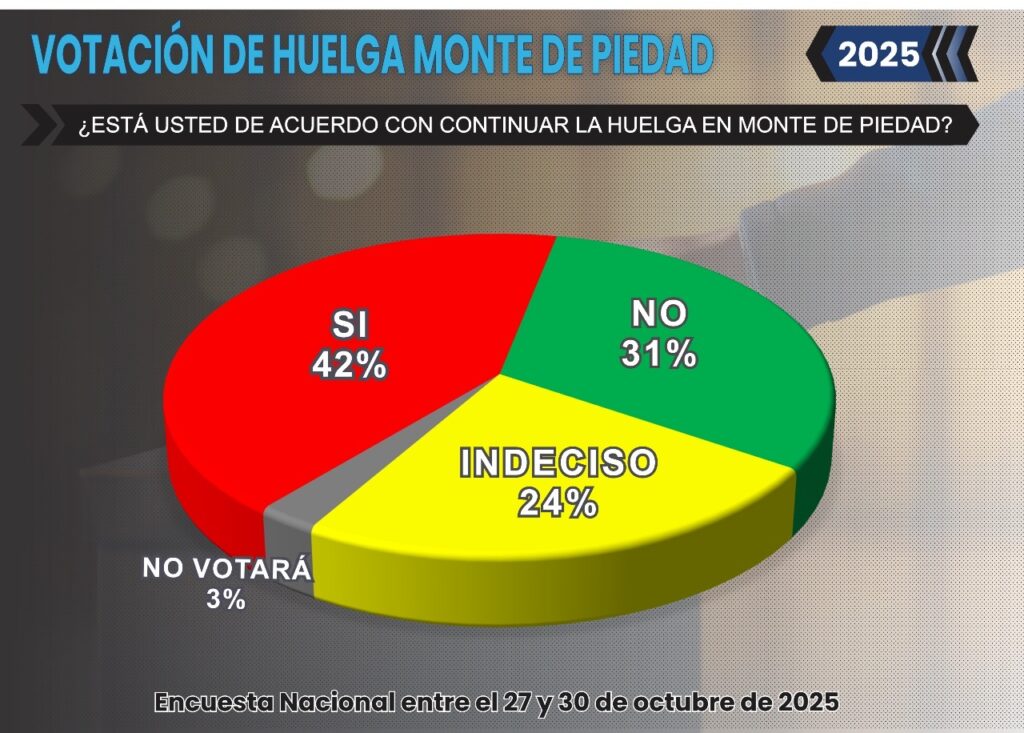 La encuesta aplicada entre el 27 de octubre y el 30 de octubre de 2025 a 500 trabajadores activos del Monte de Piedad en todo el país, muestra que el 42 % de los empleados consultados manifestó intención de votar por el “Sí” a la huelga, el 31 % por el “No”, mientras que un 24 % se declaró indeciso y un 3 % aseguró que no participará en el proceso.